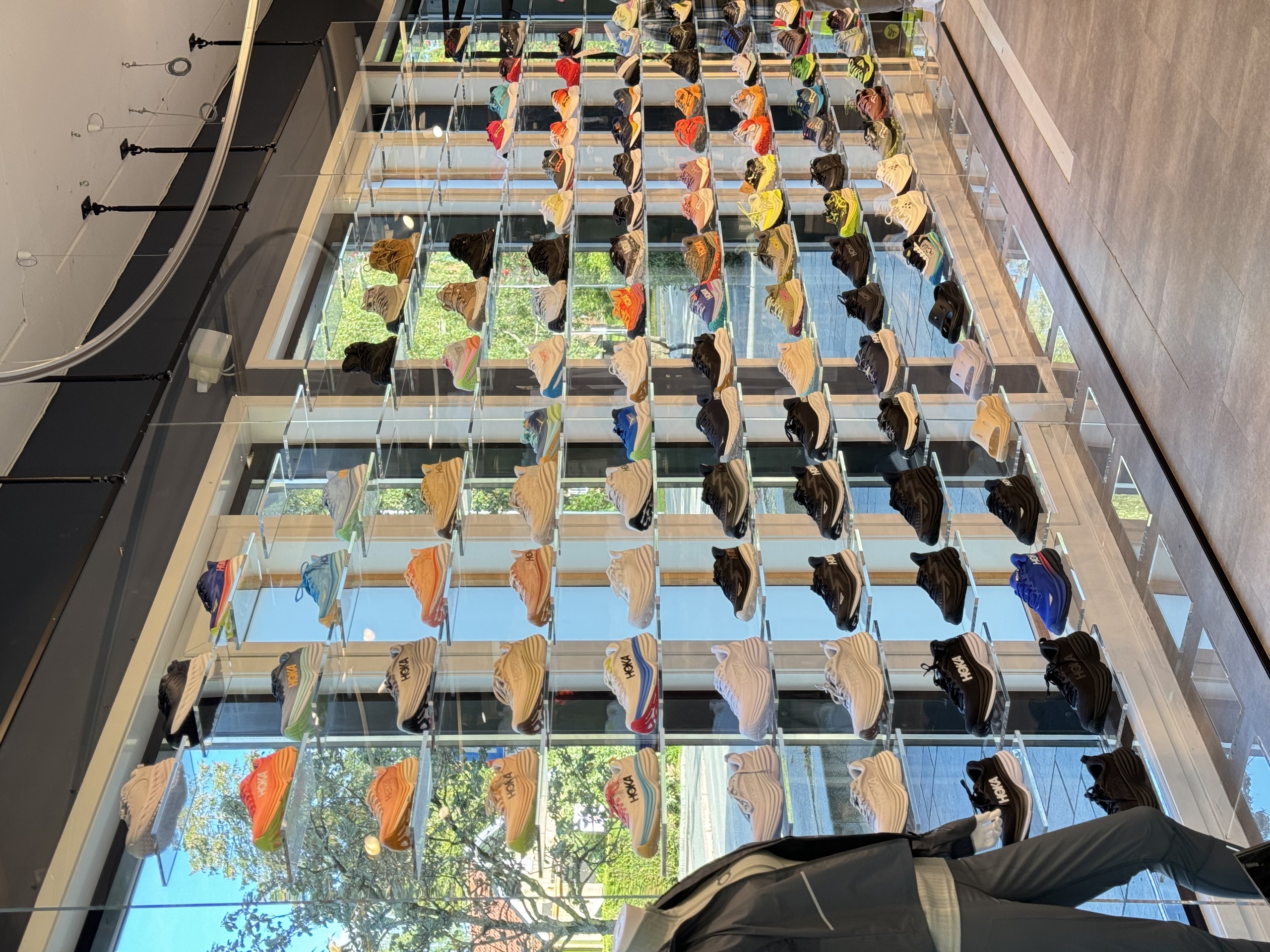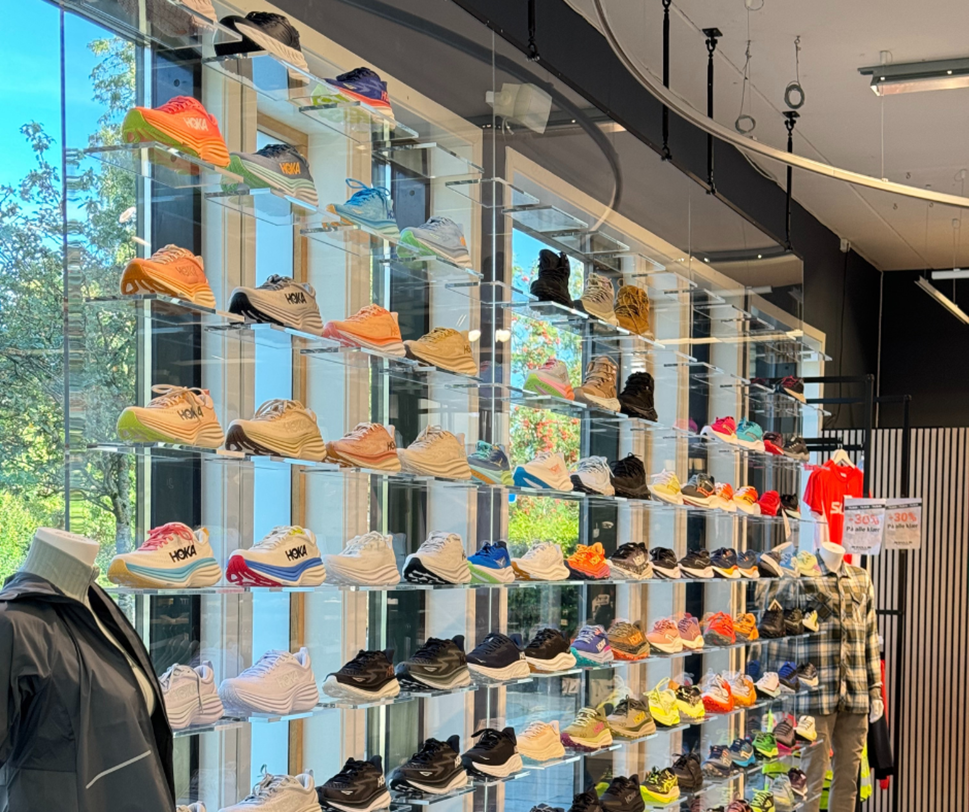 Dette displayet profilerer produktene både inne i butikken og fra utsiden. Displayet viser frem skoene på en god måte og stjeler ikke oppmerksomheten fra varene som fremstår "svevende".