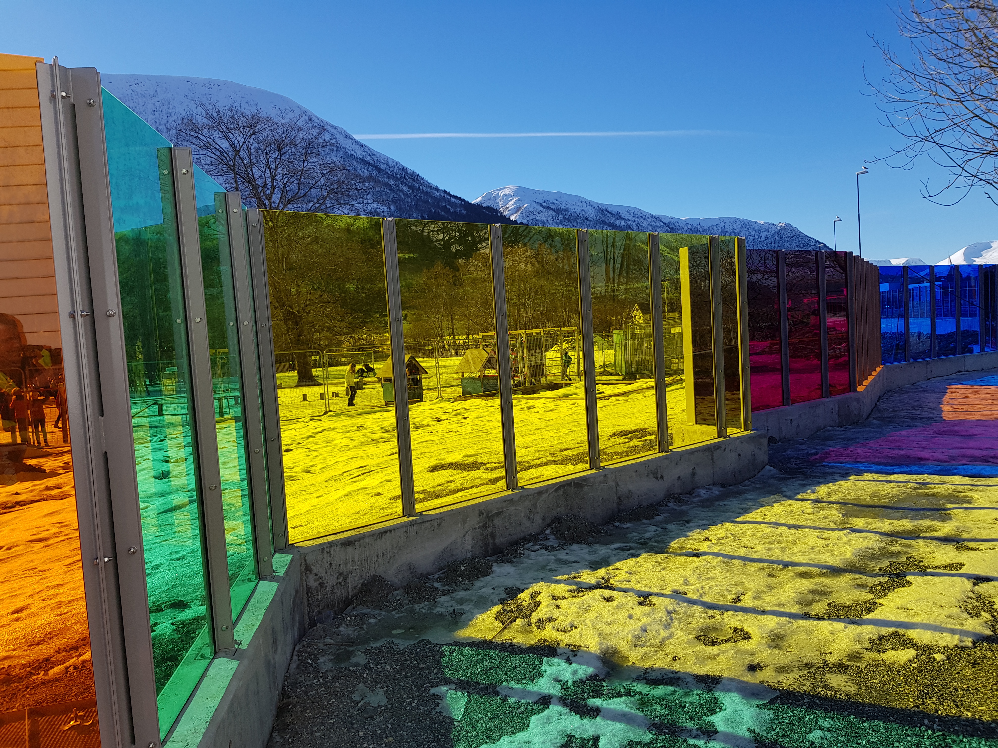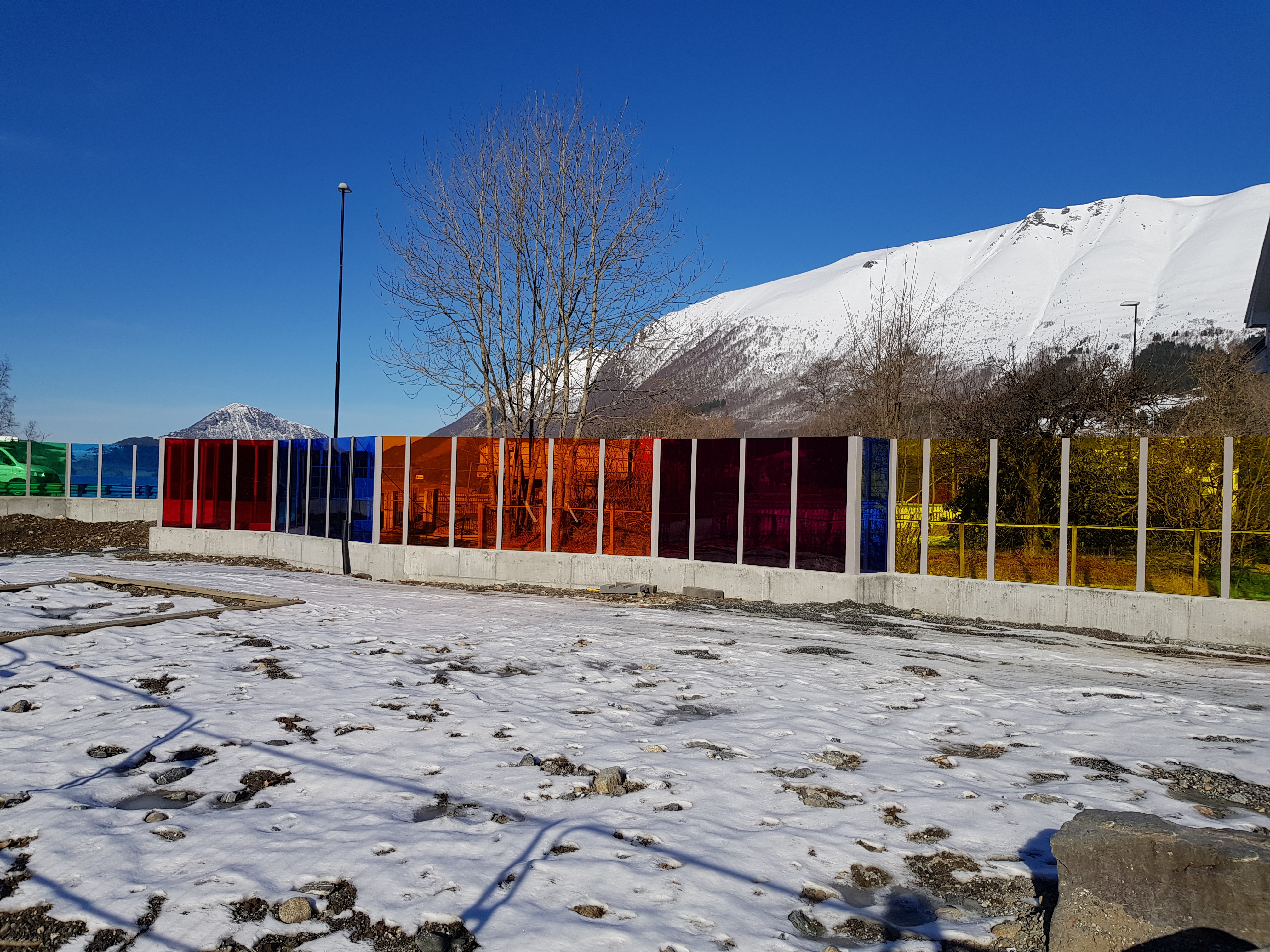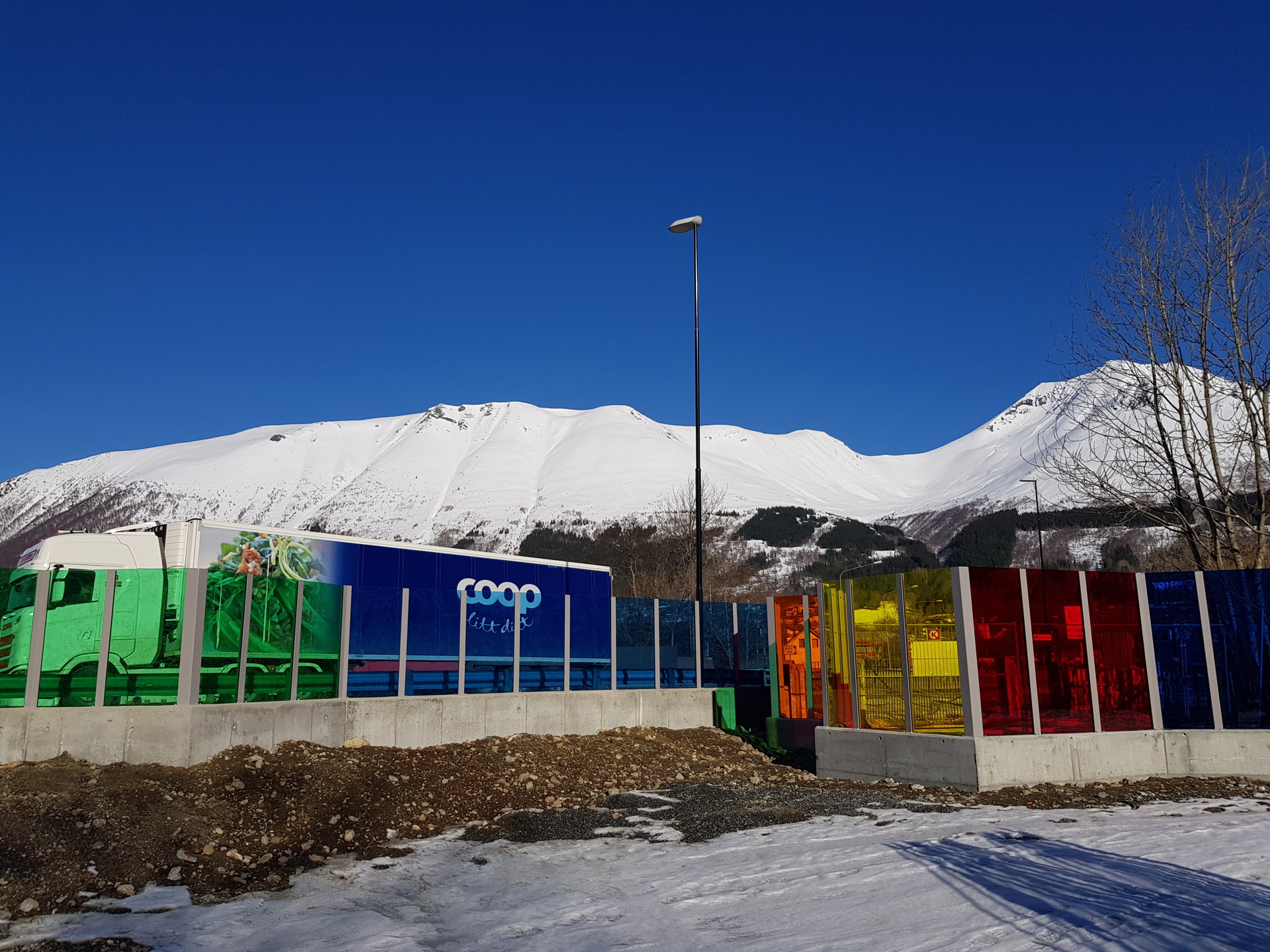 Alle er glade for at den nye støyskjermen er på plass. Trafikkstøyen er mykje mindre til plage no. Vi ser bilane køyre forbi, men vi høyrer lite av dei. Skjermen har fleire fargar, og vi kan sjå gjennom han. Særleg dei varme, fine fargane mot sentrum er veldig fargerike og gir oss godt humør.