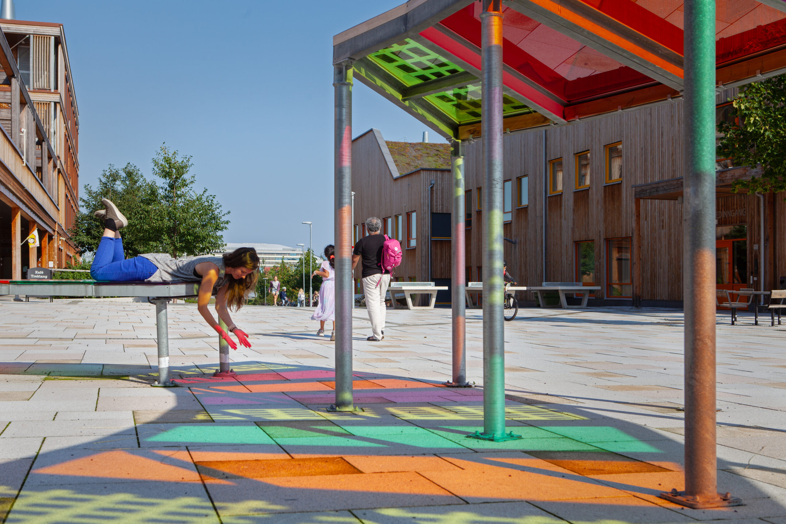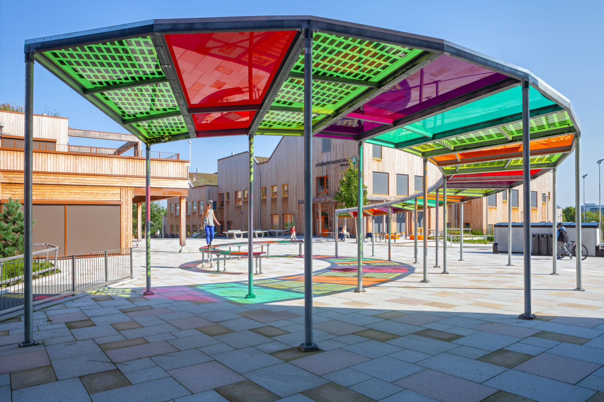 "Fargedans" er en sirkulær paviljong med et tak av gjennomsiktig farget akryl utstyrt med solceller. Dette gjør installasjonen ikke bare vakker, men også miljøvennlig, da den produserer sin egen energi. De fargerike lysmønstrene gir en visuell opplevelse som skaper et levende møtepunkt for alle som besøker området. Med sitt fokus på gjenbruk har Plexon levert gjennomsiktig farget akryl til prosjektet, der mye av materialet stammer fra tidligere prosjekter – en ekte hyllest til bærekraft og gjenbruk.