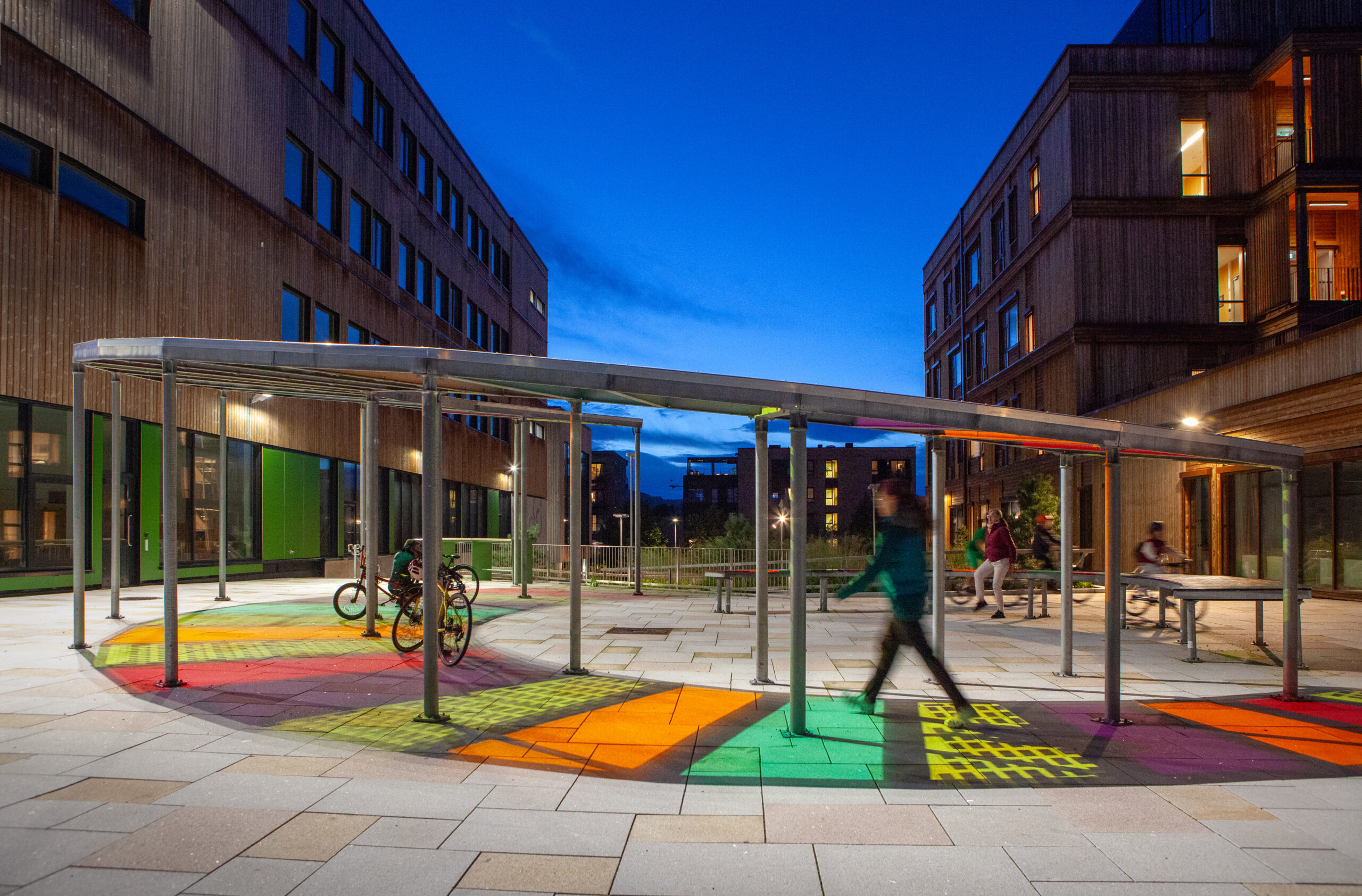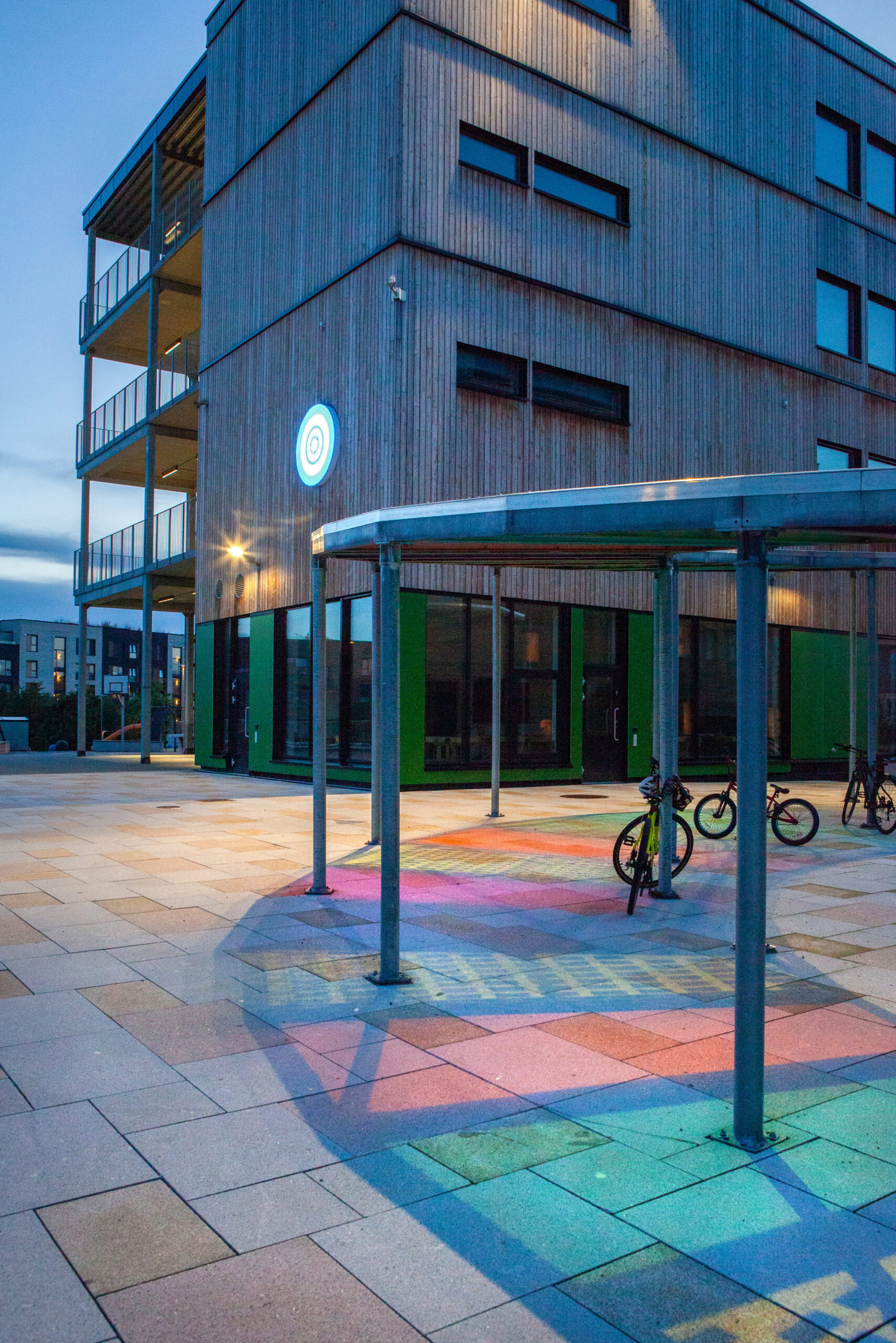 På Treklang-torget på Oksenøya finner du de imponerende installasjonene "Solen" og "Fargedans", utviklet av de kreative hodene hos Zenisk. Disse nøkkelinstallasjonene er designet for å skape identitet og fremme sosial bærekraft, i et område med skole, barnehage og bo- og behandlingssenter.