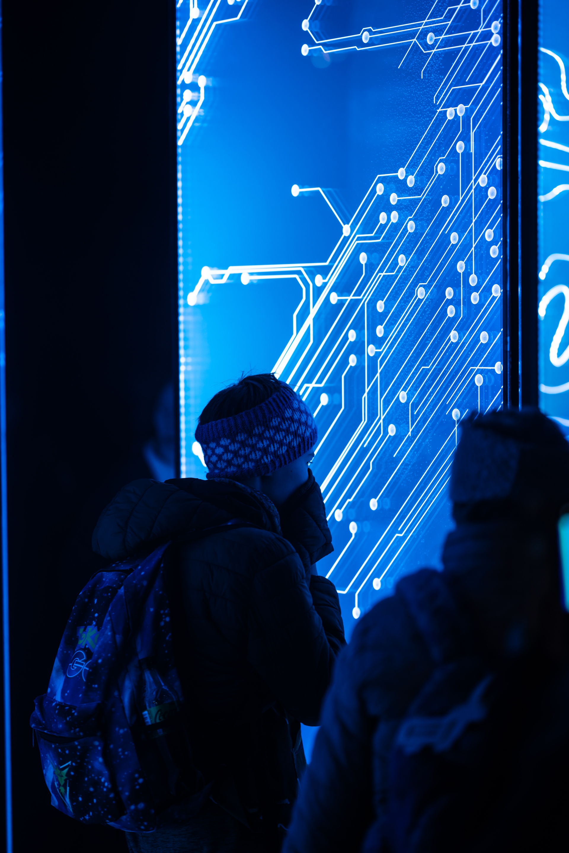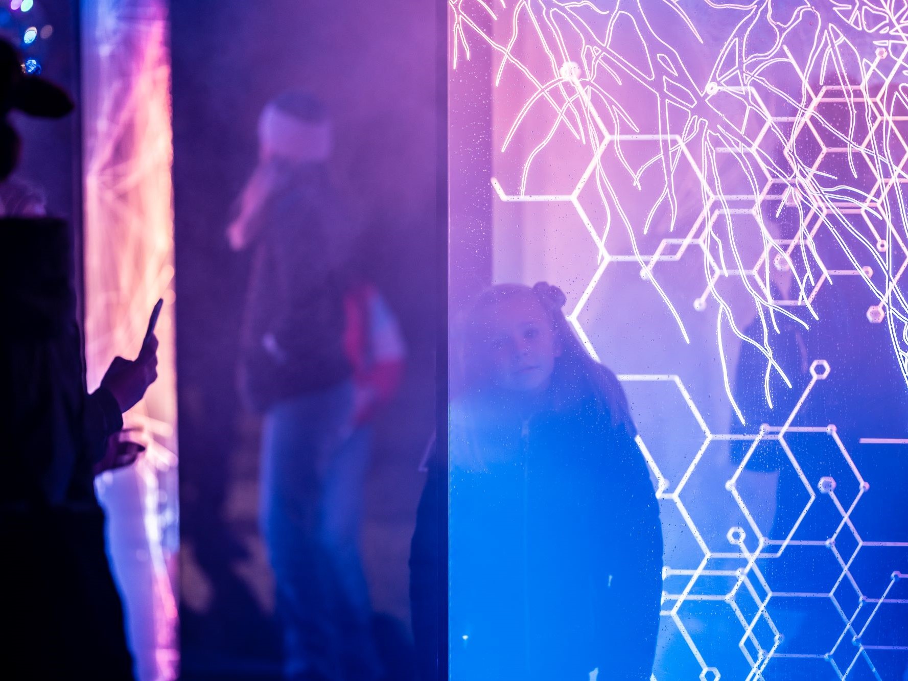Publikum beveger seg gjennom installasjonen og silhuettene deres blir et viktig element i den visuelle opplevelsen som inviterer til en engasjerende refleksjon over vår felles fremtid.