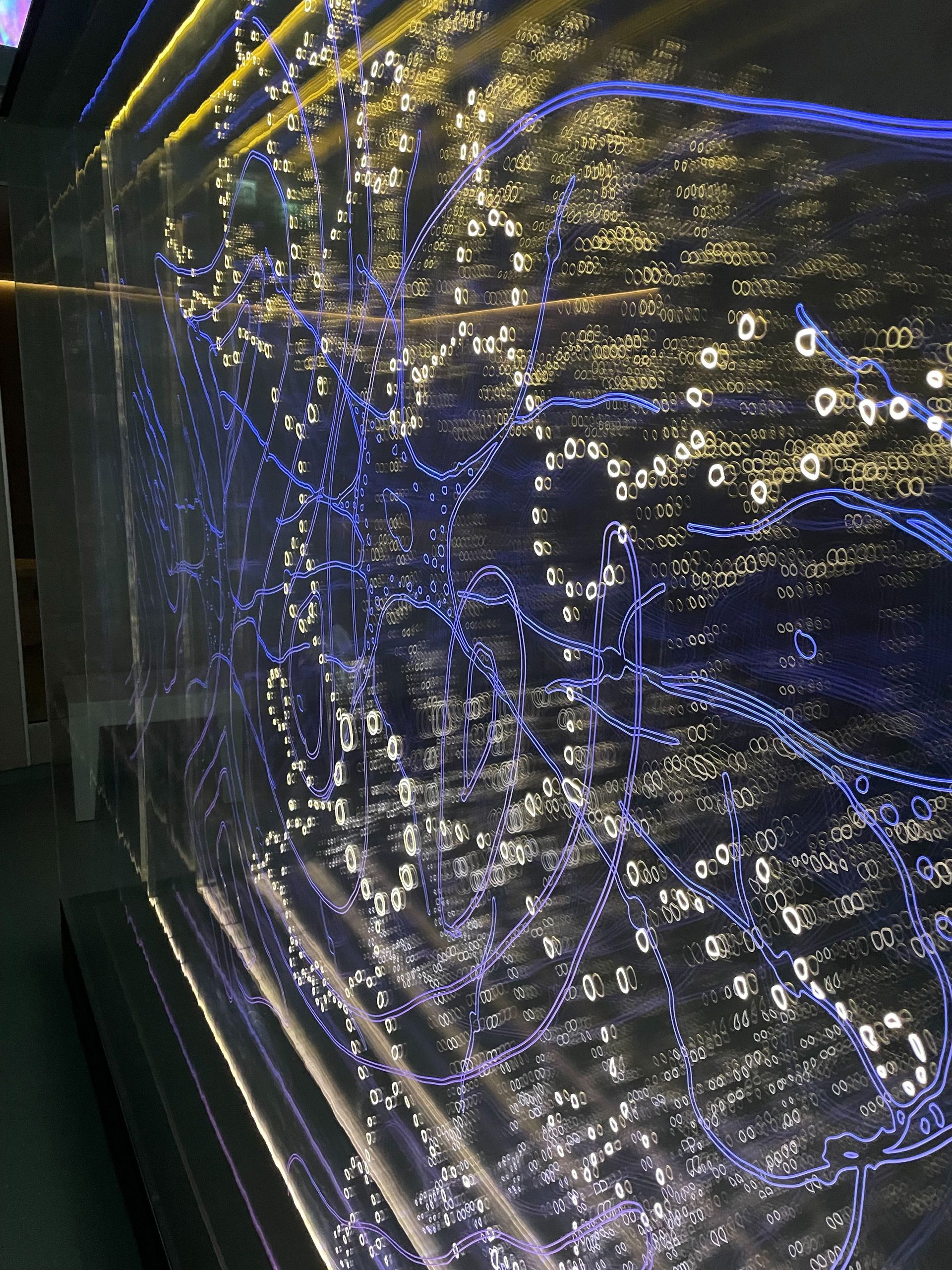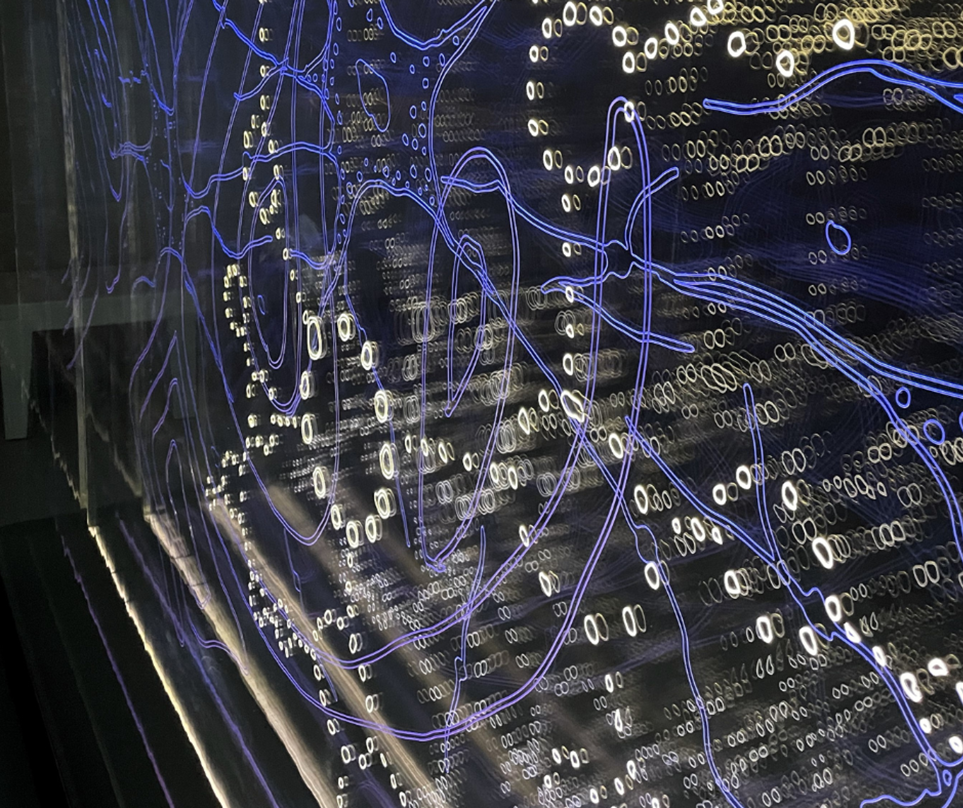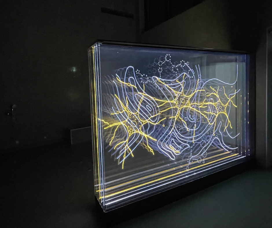 Plexiglass platene er gravert med komplekse mønster inspirert av bildediagnostikk, hjerneskanning, nervebaner, anatomi, vind, væske. Plexon har levert de graverte plexiglass plater og LED montert på Endlighten plate for lys styring.