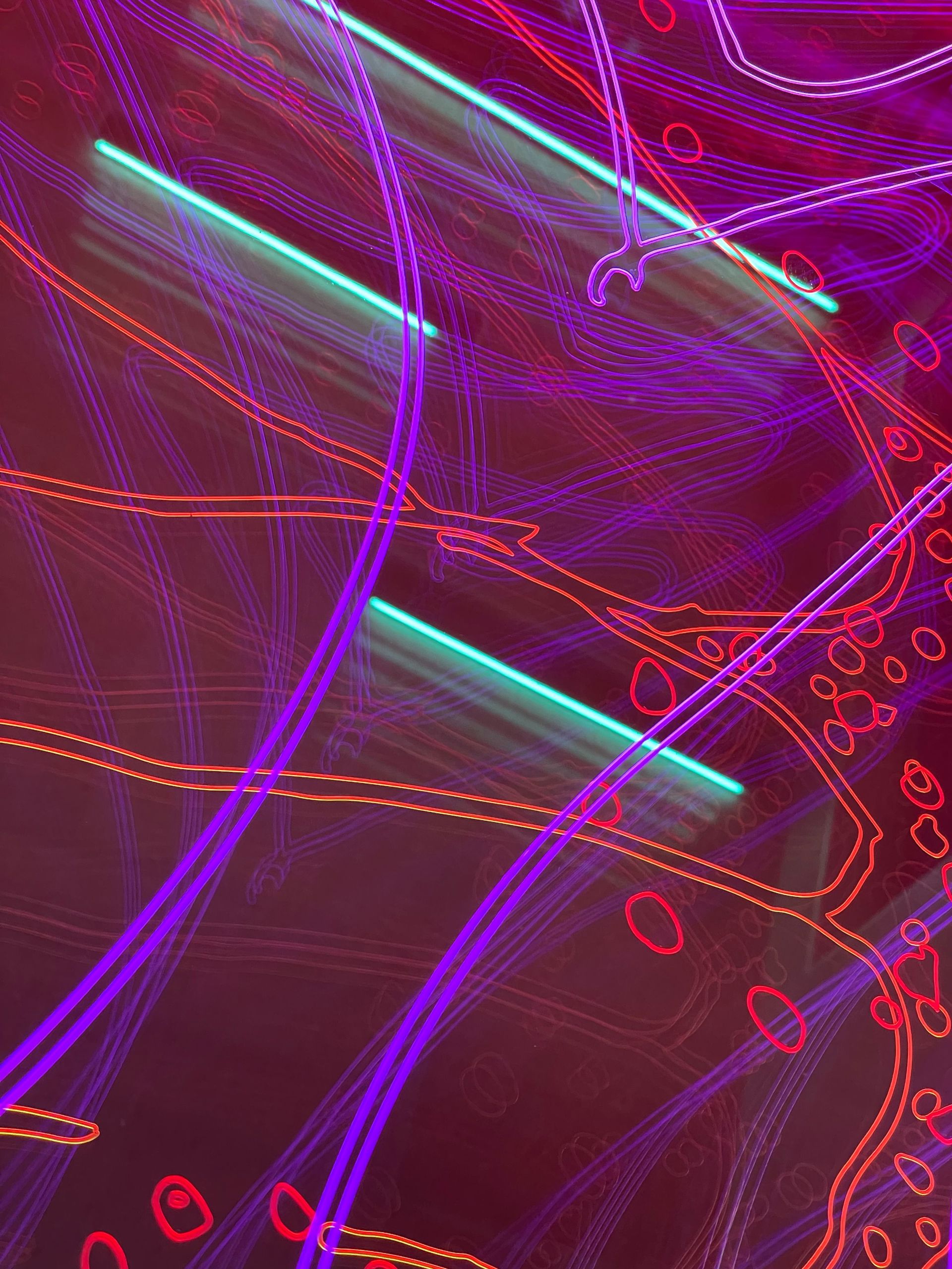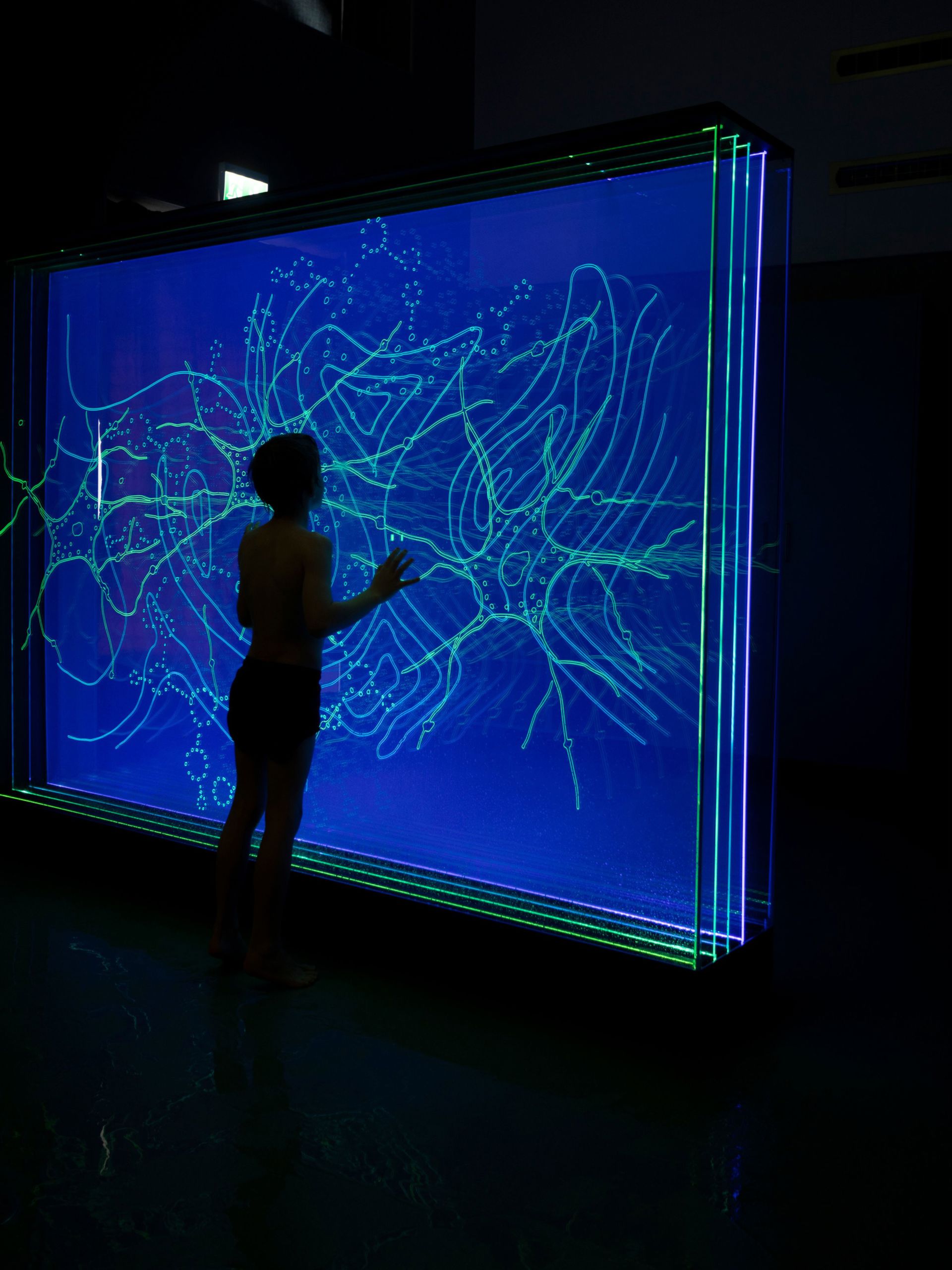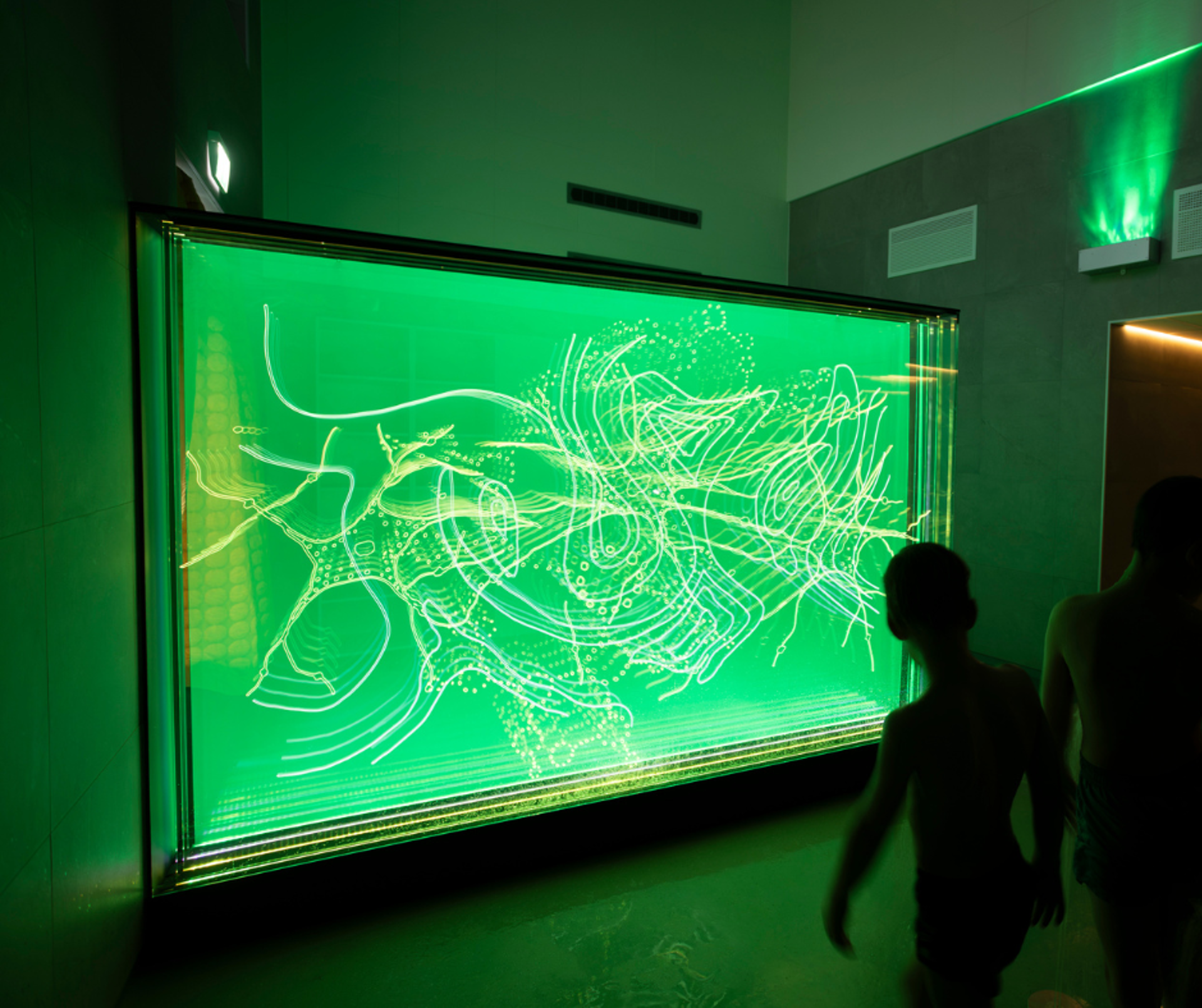 Plexiglass platene er gravert med komplekse mønster inspirert av bildediagnostikk, hjerneskanning, nervebaner, anatomi, vind, væske. Plexon har levert de graverte plexiglass plater og LED montert på Endlighten plate for lys styring.
